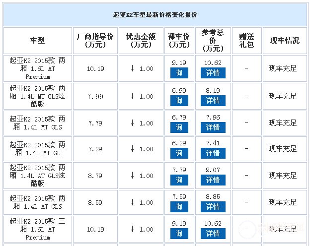 近日,本店内起亚K2现车销售,颜色可选,目前购车部分车型可优惠1.00万元,感兴趣的朋友可以到店咨询购买,详情见下表: